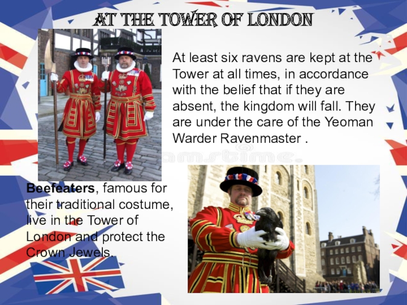 Beefeaters, famous for their traditional costume, live in the Tower of London and protect the Crown Jewels.