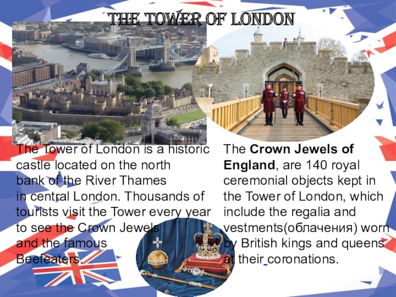 The Crown Jewels of England, are 140 royal ceremonial objects kept in the Tower of London, which include the regalia and vestments(облачения) worn by British kings and queens at their coronations.
