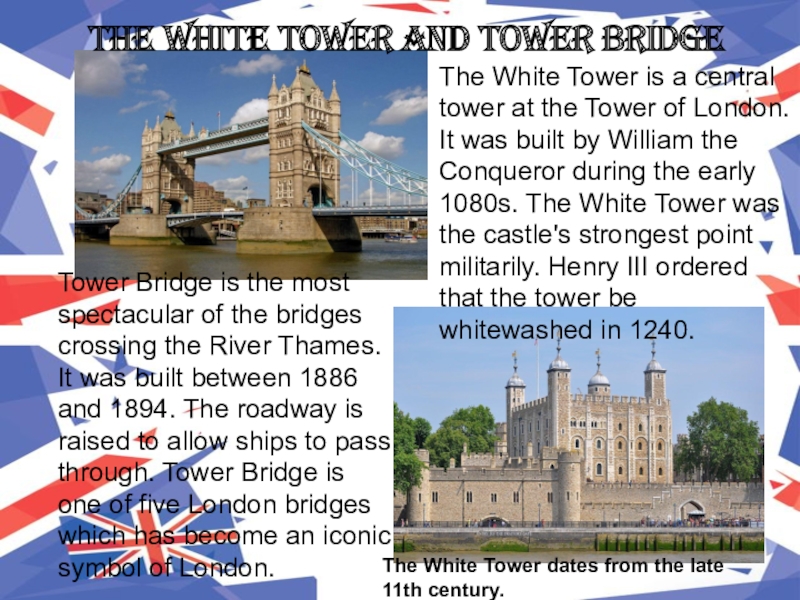 The White Tower is a central tower at the Tower of London. It was built by William the Conqueror during the early 1080s. The White Tower was the castle's strongest point militarily. Henry III ordered that the tower be whitewashed in 1240.