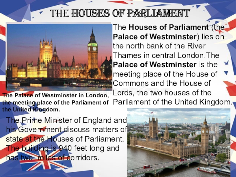 The Houses of Parliament (the Palace of Westminster) lies on the north bank of the River Thames in central London. The Palace of Westminster is the meeting place of the House of Commons and the House of Lords, the two houses of the Parliament of the United Kingdom.