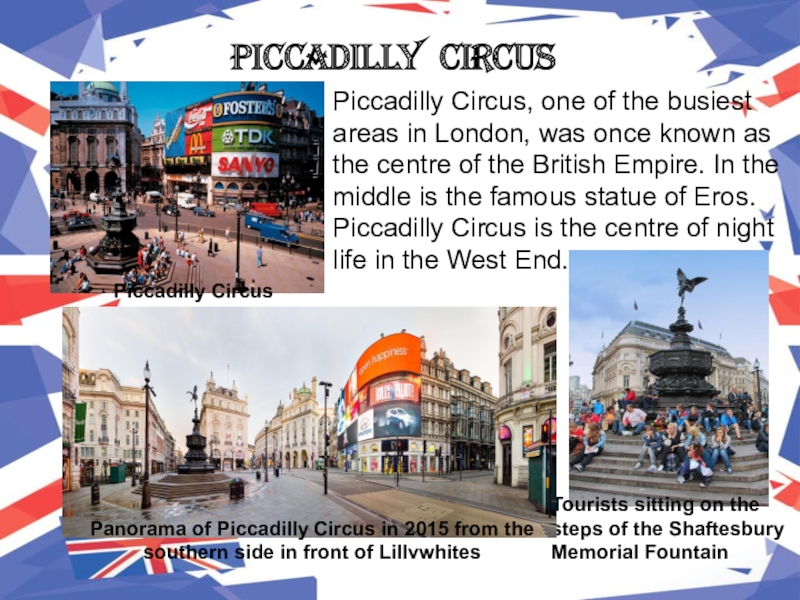 Piccadilly Circus, one of the busiest areas in London, was once known as the centre of the British Empire. In the middle is the famous statue of Eros. Piccadilly Circus is the centre of night life in the West End.