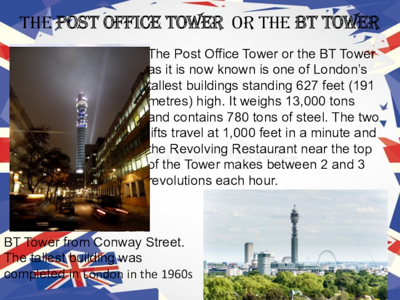 The Post Office Tower or the BT Tower as it is now known is one of London’s tallest buildings standing 627 feet (191 metres) high. It weighs 13,000 tons and contains 780 tons of steel. The two lifts travel at 1,000 feet in a minute and the Revolving Restaurant near the top of the Tower makes between 2 and 3 revolutions each hour.