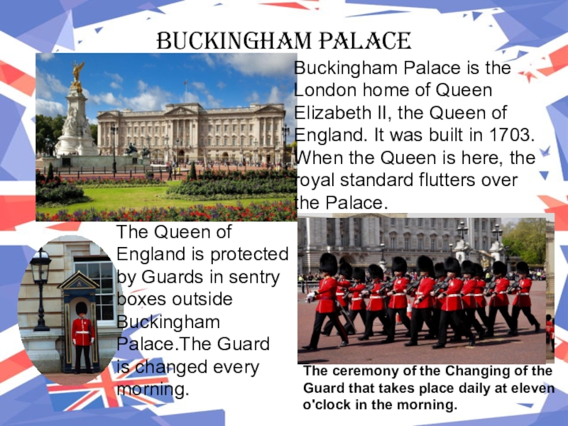 The Queen of England is protected by Guards in sentry boxes outside Buckingham Palace.The Guard