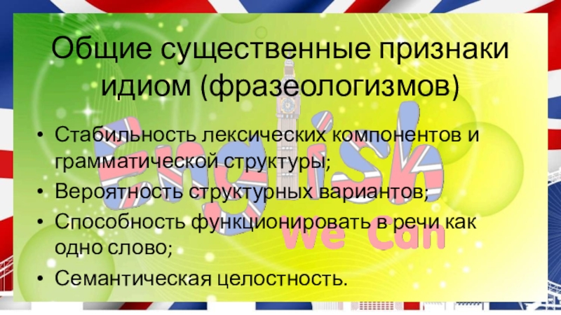 Слайд 13Общие существенные признаки идиом (фразеологизмов)