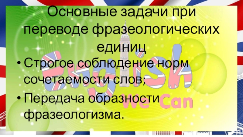 Слайд 17Основные задачи при переводе фразеологических единиц