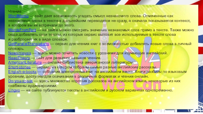 WordsFromText — на сайте можно смотреть значение незнакомых слов прямо в тексте. Также можно сюда добавлять свои тексты, из которых сервис выловит все используемые в тексте слова и разбросает их в виде словаря.