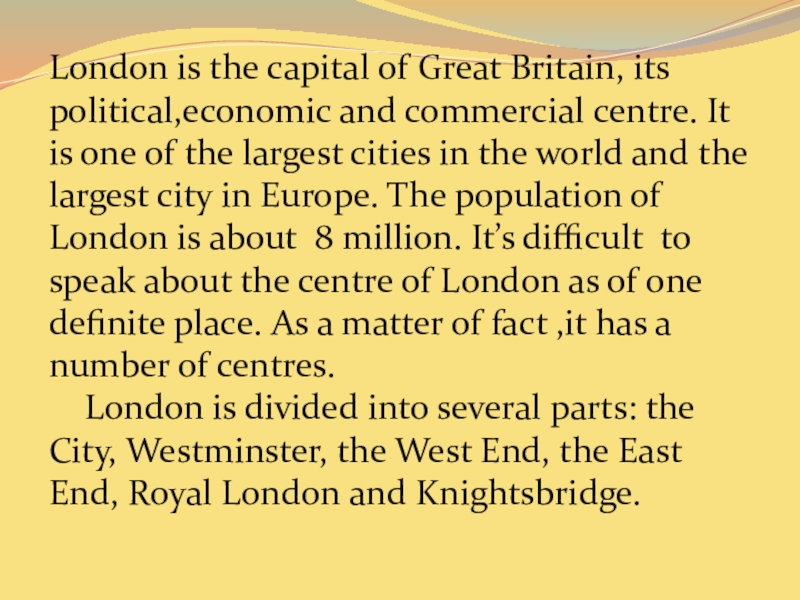centre. It is one of the largest cities in the world and the largest city in Europe. The population of London is about 8 million. It’s difficult to speak about the centre of London as of one definite place. As a matter of fact ,it has a number of centres.