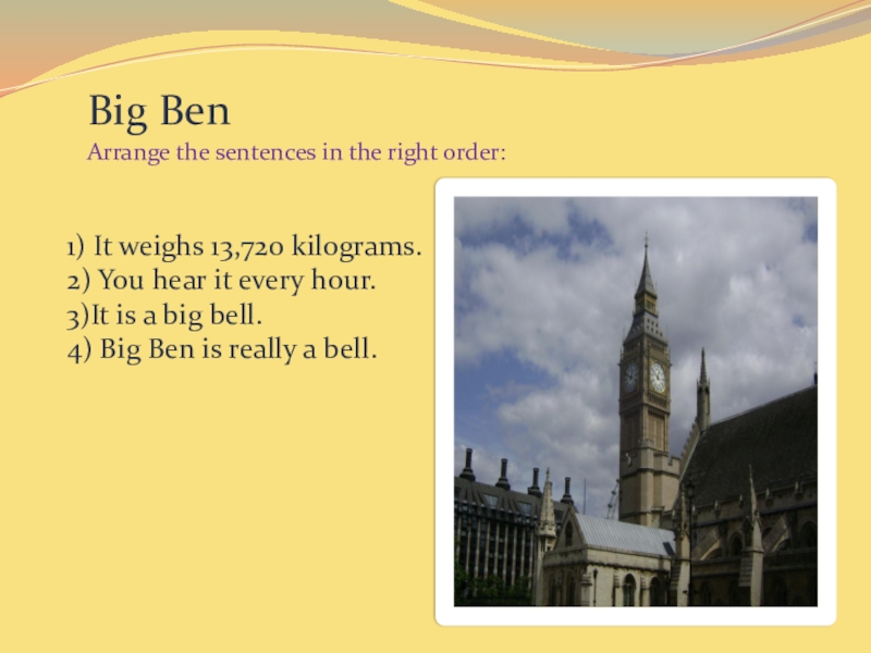 2) It stands near the Houses of Parliament. It is really a bell. It weighs 13,720 kilograms. It has a deep tone and you can hear it on the radio. It is a famous clock.