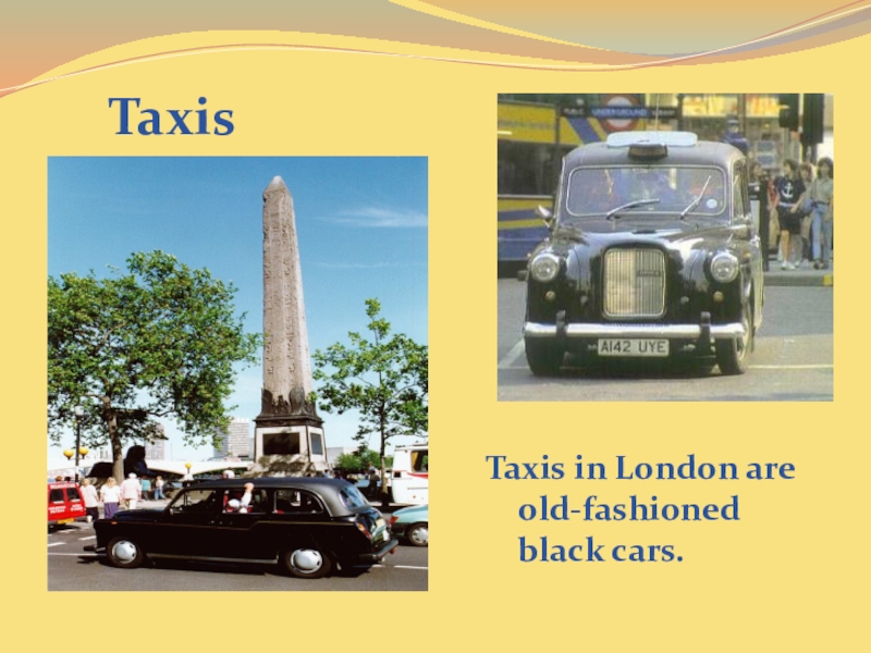 Taxis in London are old-fashioned black cars.