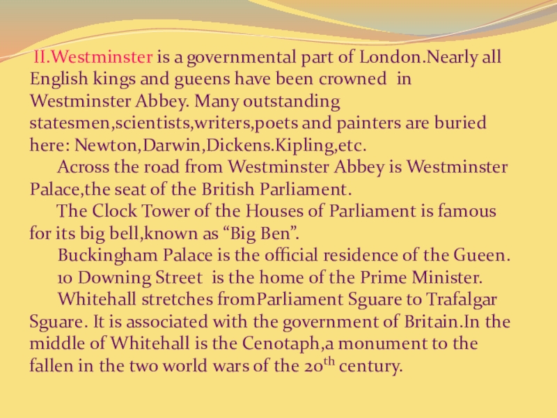 Слайд 6 II.Westminster is a governmental part of London.Nearly all English kings