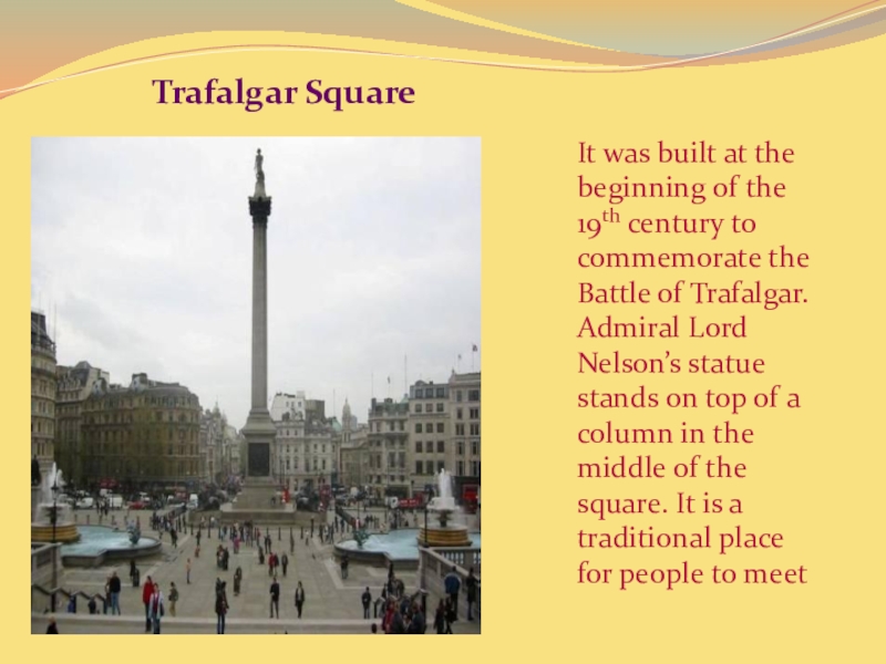 to commemorate the Battle of Trafalgar. Admiral Lord Nelson’s statue stands on top of a column in the middle of the square. It is a traditional place for people to meet