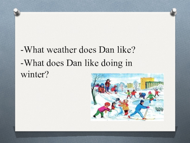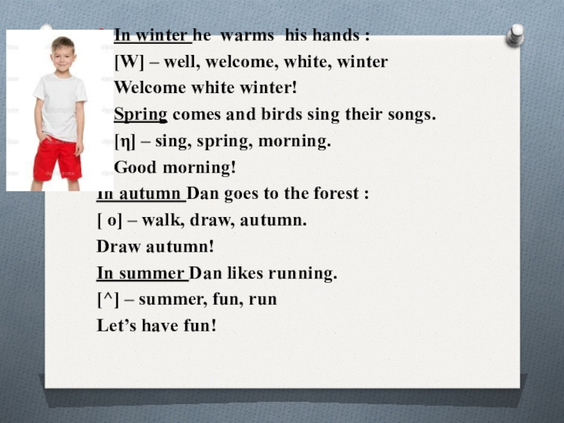 In winter he warms his hands :[W] – well, welcome, white, winterWelcome white winter!Spring comes and birds sing their songs.[η] – sing, spring, morning.Good morning!In autumn Dan goes to the forest :[ o] – walk, draw, autumn.Draw autumn!In summer Dan
