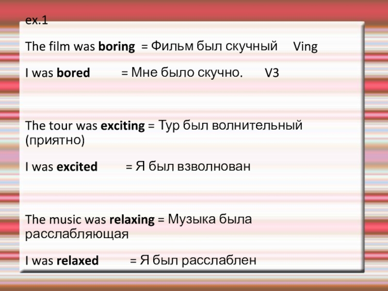 ex.1The film was boring = Фильм был скучный   VingI was bored