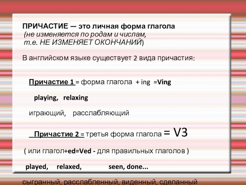 ПРИЧАСТИЕ — это личная форма глагола (не изменяется по родам и числам, т.е. НЕ ИЗМЕНЯЕТ ОКОНЧАНИЙ)В английском языке существует 2 вида причастия: Причастие 1 = форма глагола + ing =Ving