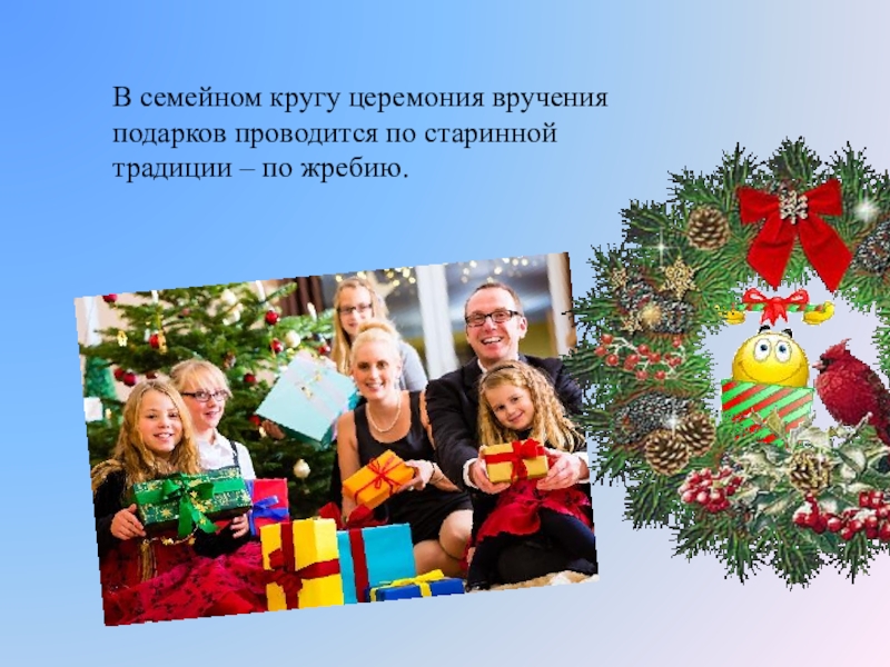 Слайд 10В семейном кругу церемония вручения подарков проводится по старинной традиции – по жребию.