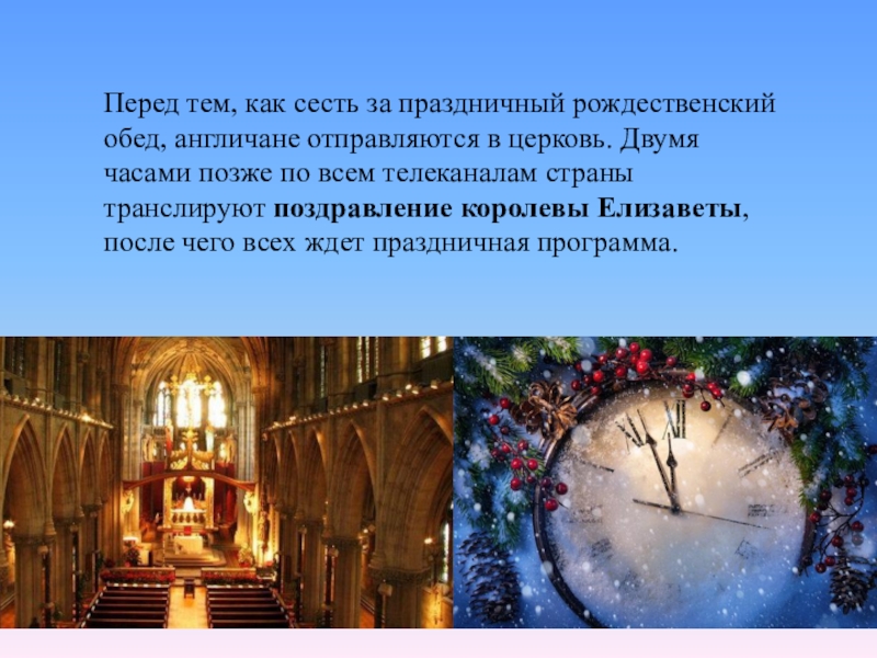 Слайд 5Перед тем, как сесть за праздничный рождественский обед, англичане отправляются в