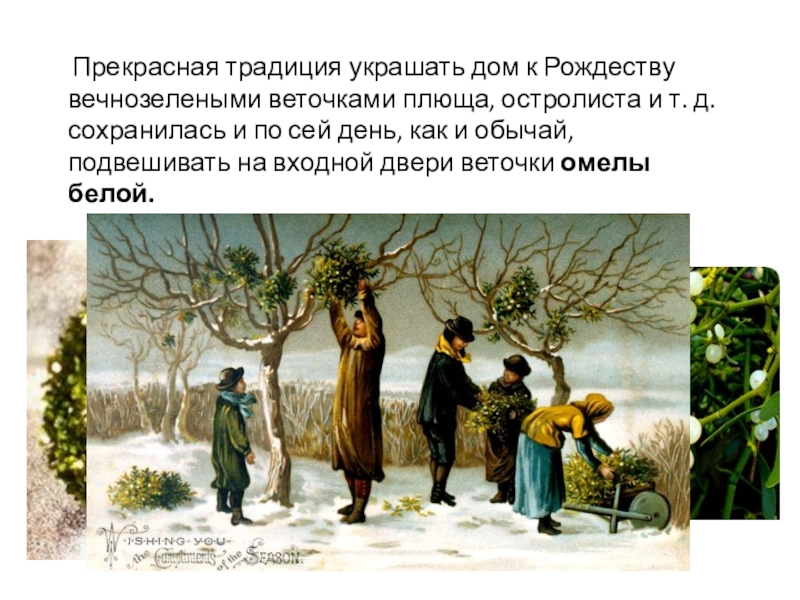 Слайд 4 Прекрасная традиция украшать дом к Рождеству вечнозелеными веточками плюща, остролиста и