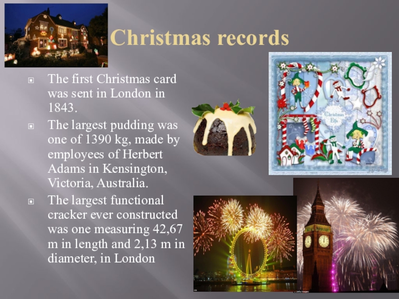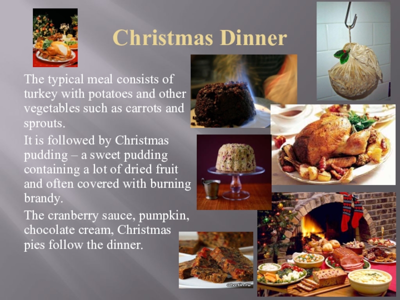 It is followed by Christmas pudding – a sweet pudding containing a lot of dried fruit and often covered with burning brandy.