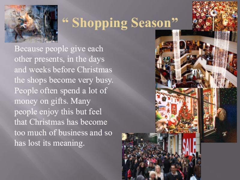 and weeks before Christmas the shops become very busy. People often spend a lot of money on gifts. Many people enjoy this but feel that Christmas has become too much of business and so has lost its meaning.