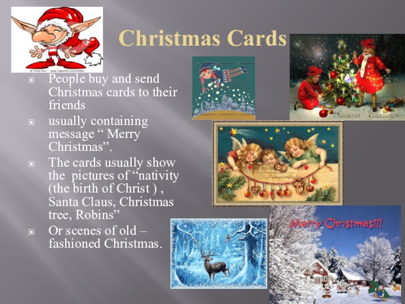 The cards usually show the pictures of “nativity (the birth of Christ ) , Santa Claus, Christmas tree, Robins”