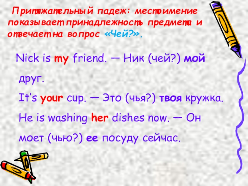 Nick is my friend. — Ник (чей?) мой друг.