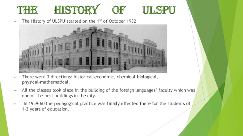 The History of ULSPUThe History of ULSPU started on the 1st of October 1932There were 3 directions: historical-economic, chemical-biological, physical-mathematical. All the classes took place in the building of the
