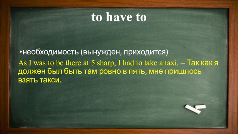 to have to необходимость (вынужден, приходится)	As I was to be there at 5 sharp, I had to