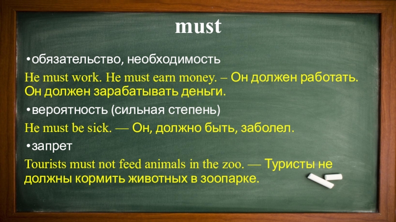 must обязательство, необходимость	He must work. He must earn money. – Он должен работать. Он должен зарабатывать деньги.вероятность