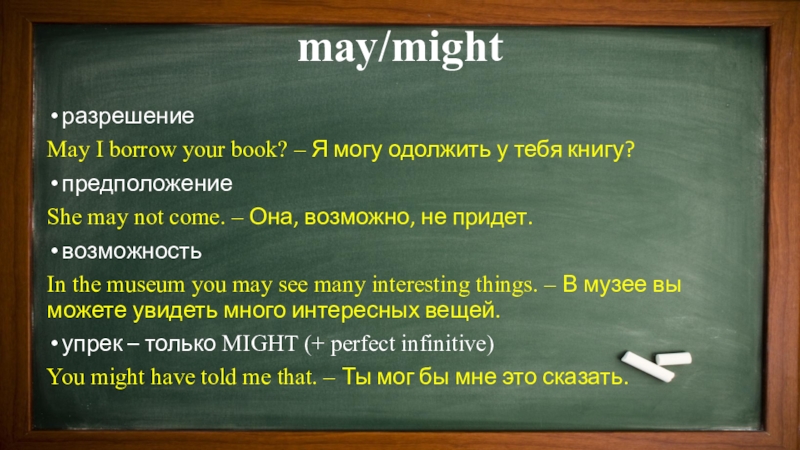 may/might разрешение	May I borrow your book? – Я могу одолжить у тебя книгу?предположение	She may not come. –