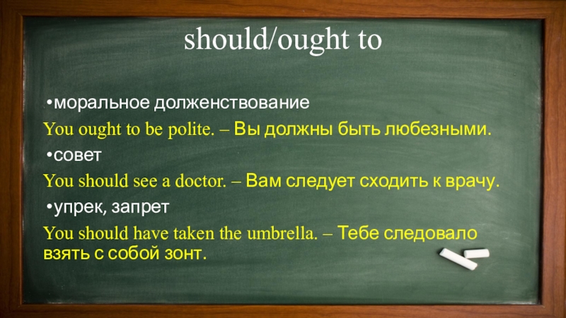 should/ought to моральное долженствование	You ought to be polite. – Вы должны быть любезными.совет	You should see a doctor.