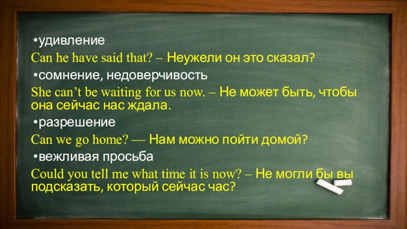 удивление	Can he have said that? – Неужели он это сказал?сомнение, недоверчивость	She can’t be waiting for us now.