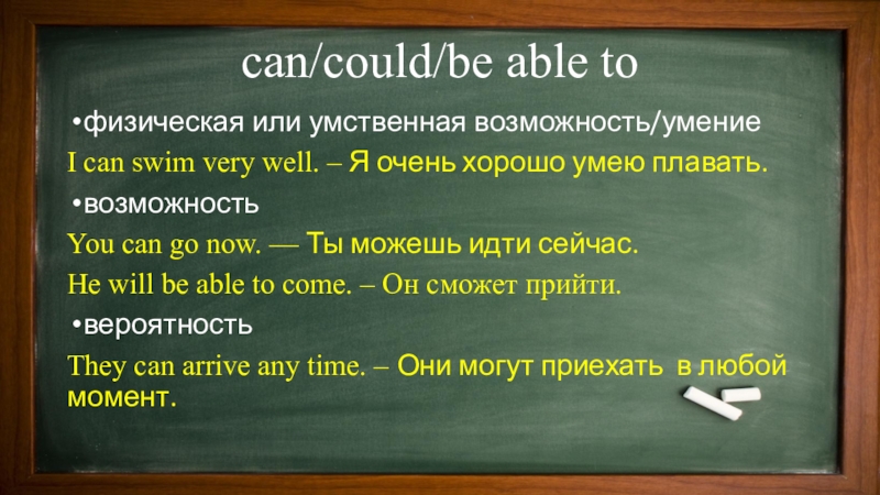 can/could/be able to физическая или умственная возможность/умение	I can swim very well. – Я очень хорошо умею плавать.возможностьYou