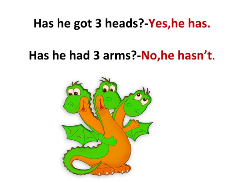 Слайд 20 Has he got 3 heads?-Yes,he has. Has he had 3 arms?-No,he hasn’t.