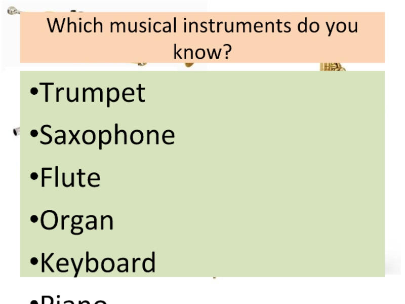 Which musical instruments do you know?TrumpetSaxophoneFluteOrganKeyboardPianoViolinCello guitar