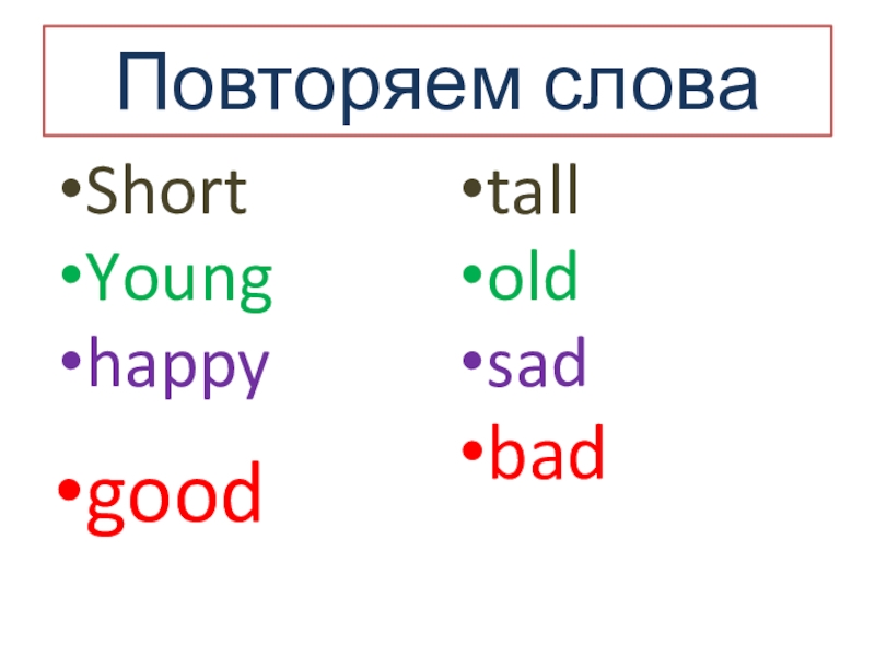 Повторяем словаShortYoung happygoodtalloldsadbad
