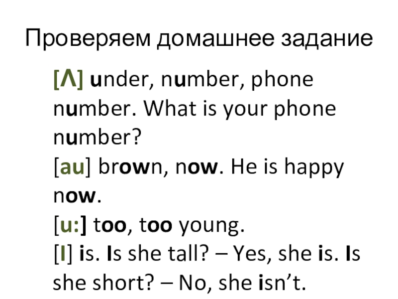 Проверяем домашнее задание[Λ] under, number, phone number. What is your phone number? [au] brown, now. He is happy now.[u:] too, too young. [I] is. Is she tall? – Yes, she is. Is she short? – No,
