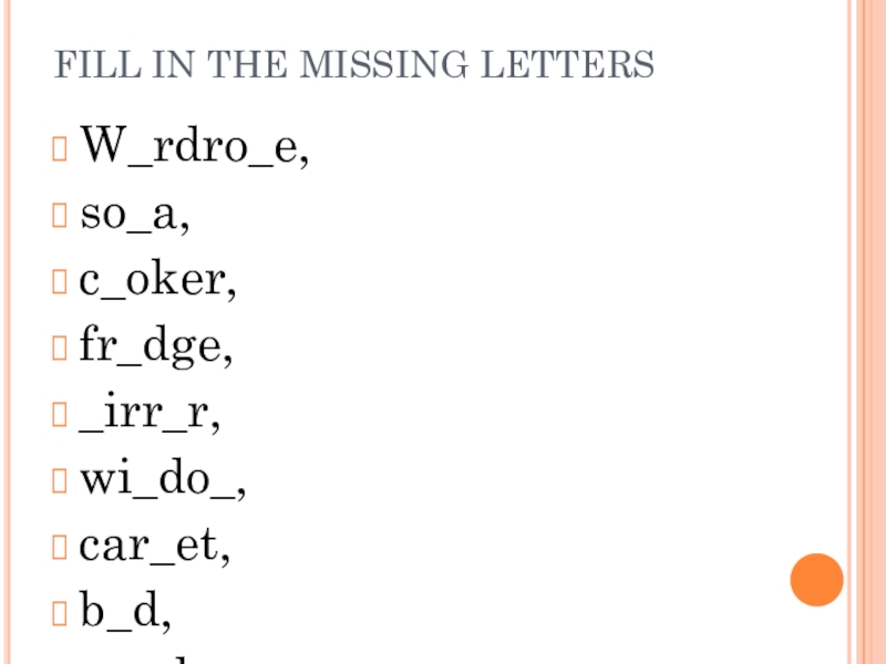 FILL IN THE MISSING LETTERSW_rdro_e, so_a, c_oker, fr_dge, _irr_r, wi_do_, car_et, b_d, ar_cha_r, ta_le, ch_ir, si_k.