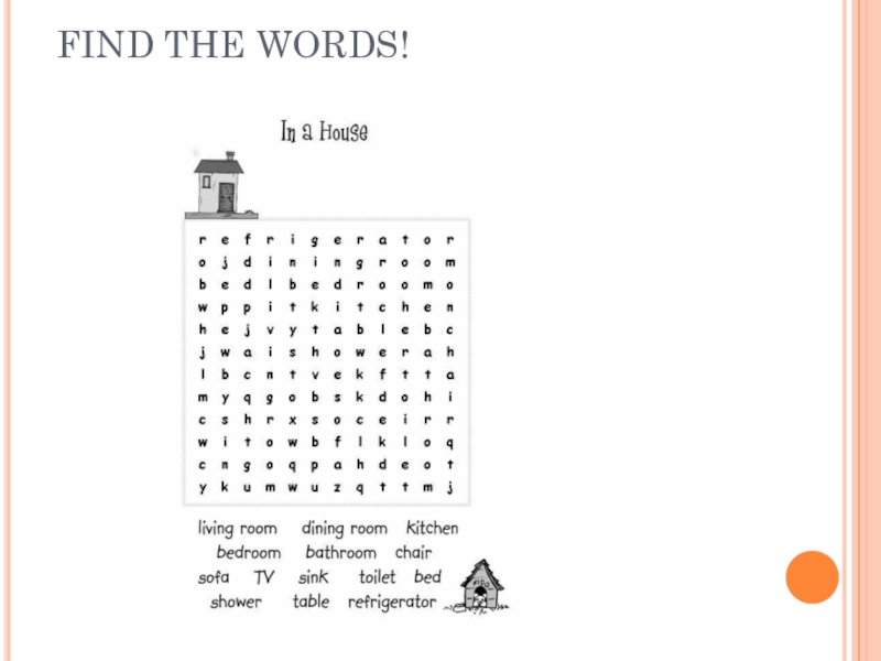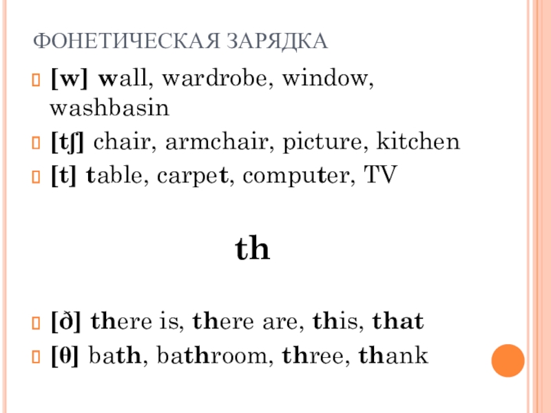 ФОНЕТИЧЕСКАЯ ЗАРЯДКА[w] wall, wardrobe, window, washbasin[tʃ] chair, armchair, picture, kitchen[t] table, carpet, computer, TVth[ð] there is, there are, this, that[θ] bath, bathroom, three, thank