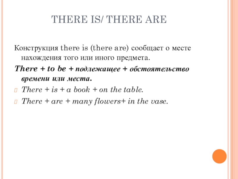 THERE IS/ THERE AREКонструкция there is (there are) сообщает о месте нахождения того или иного предмета.There + to