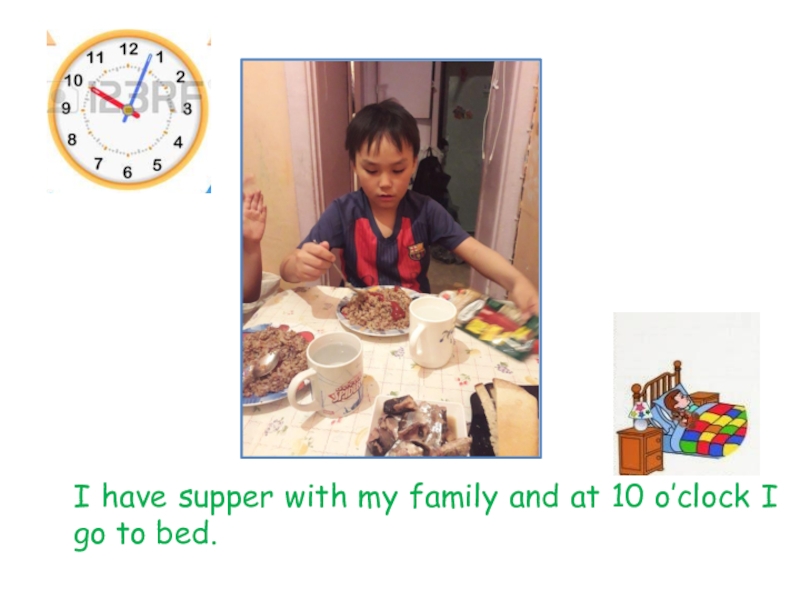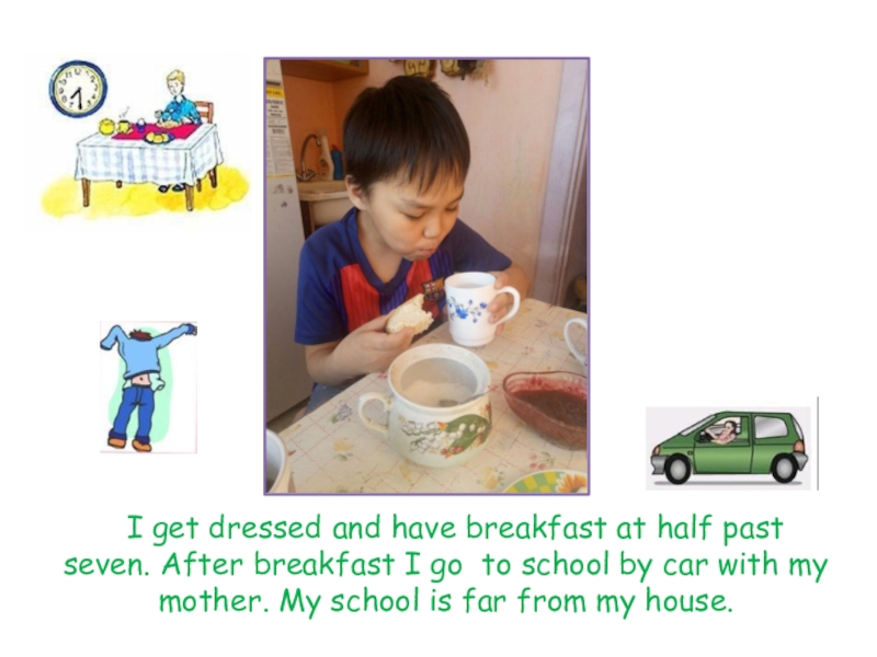 Слайд 4 I get dressed and have breakfast at half past seven.