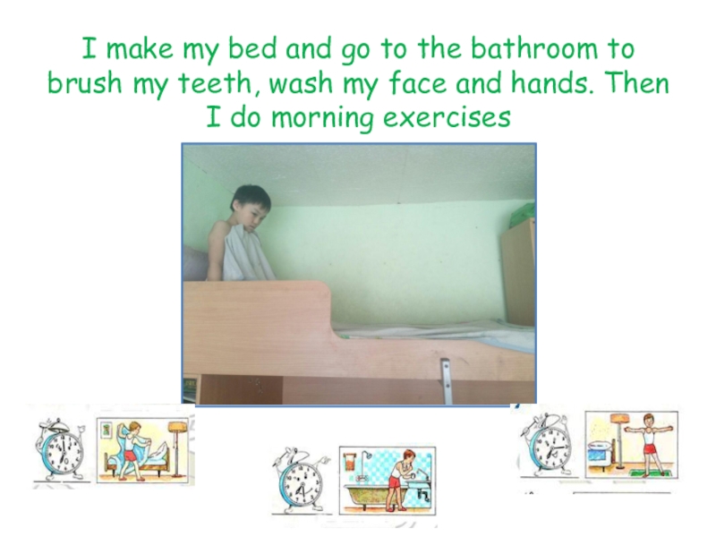 I make my bed and go to the bathroom to brush my teeth, wash my face and
