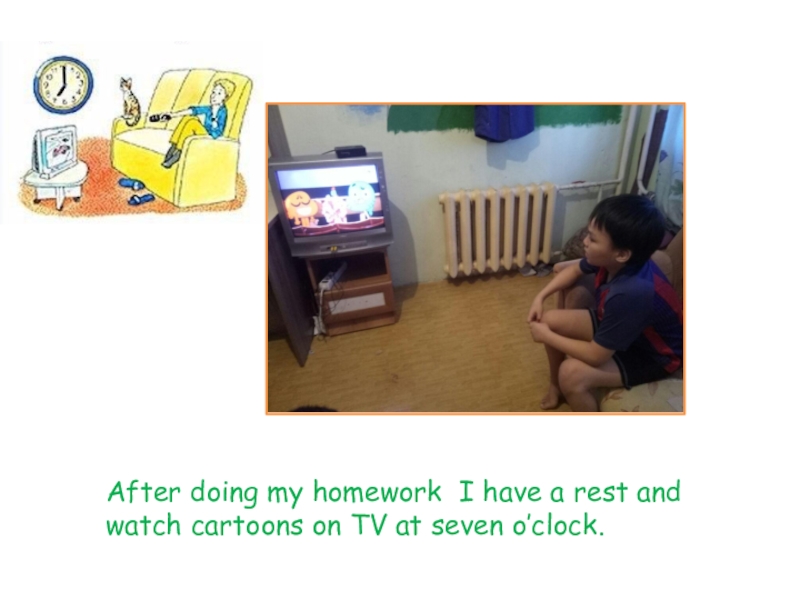 After doing my homework I have a rest and watch cartoons on TV at seven o’clock.