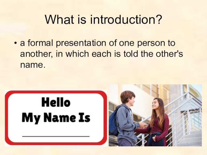 What is introduction?a formal presentation of one person to another, in which each is told the other's name.
