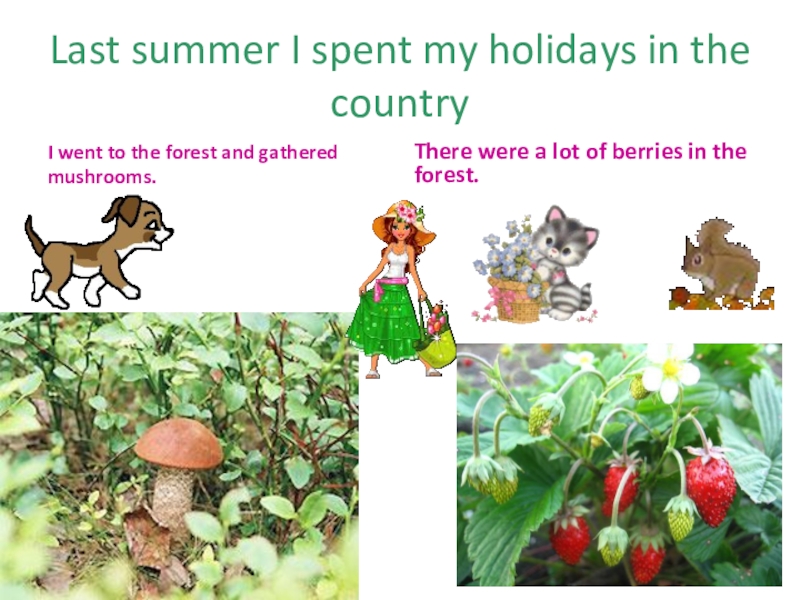 Last summer I spent my holidays in the countryI went to the forest and gathered mushrooms.There were a lot of berries in the forest.