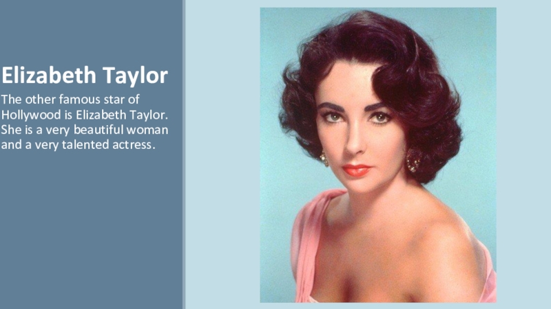 Elizabeth Taylor The other famous star of Hollywood is Elizabeth Taylor. She is a very beautiful woman