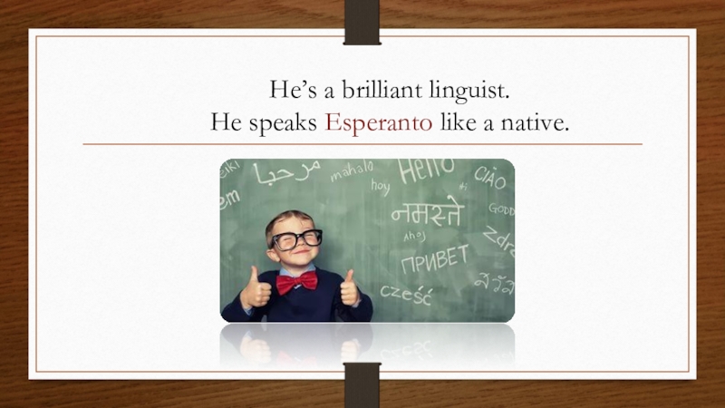 Слайд 4He’s a brilliant linguist. He speaks Esperanto like a native.