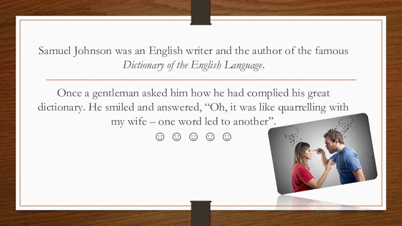 famous Dictionary of the English Language. Once a gentleman asked him how he had complied his great dictionary. He smiled and answered, “Oh, it was like quarrelling with my wife – one word led to another”.     