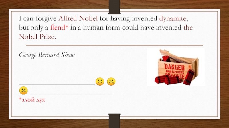 a fiend* in a human form could have invented the Nobel Prize. George Bernard Show ____________________  ______________________ *злой дух