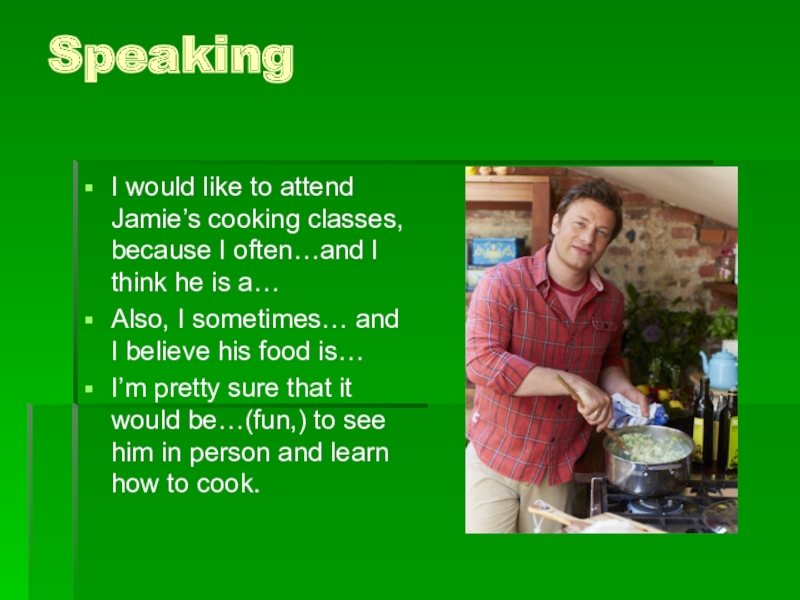 SpeakingI would like to attend Jamie’s cooking classes, because I often…and I think he is a…Also, I sometimes… and I believe his food is…I’m pretty sure that it would be…(fun,) to see him in person and