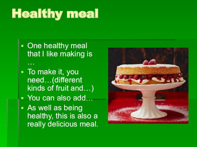 Healthy mealOne healthy meal that I like making is …To make it, you need…(different kinds of fruit